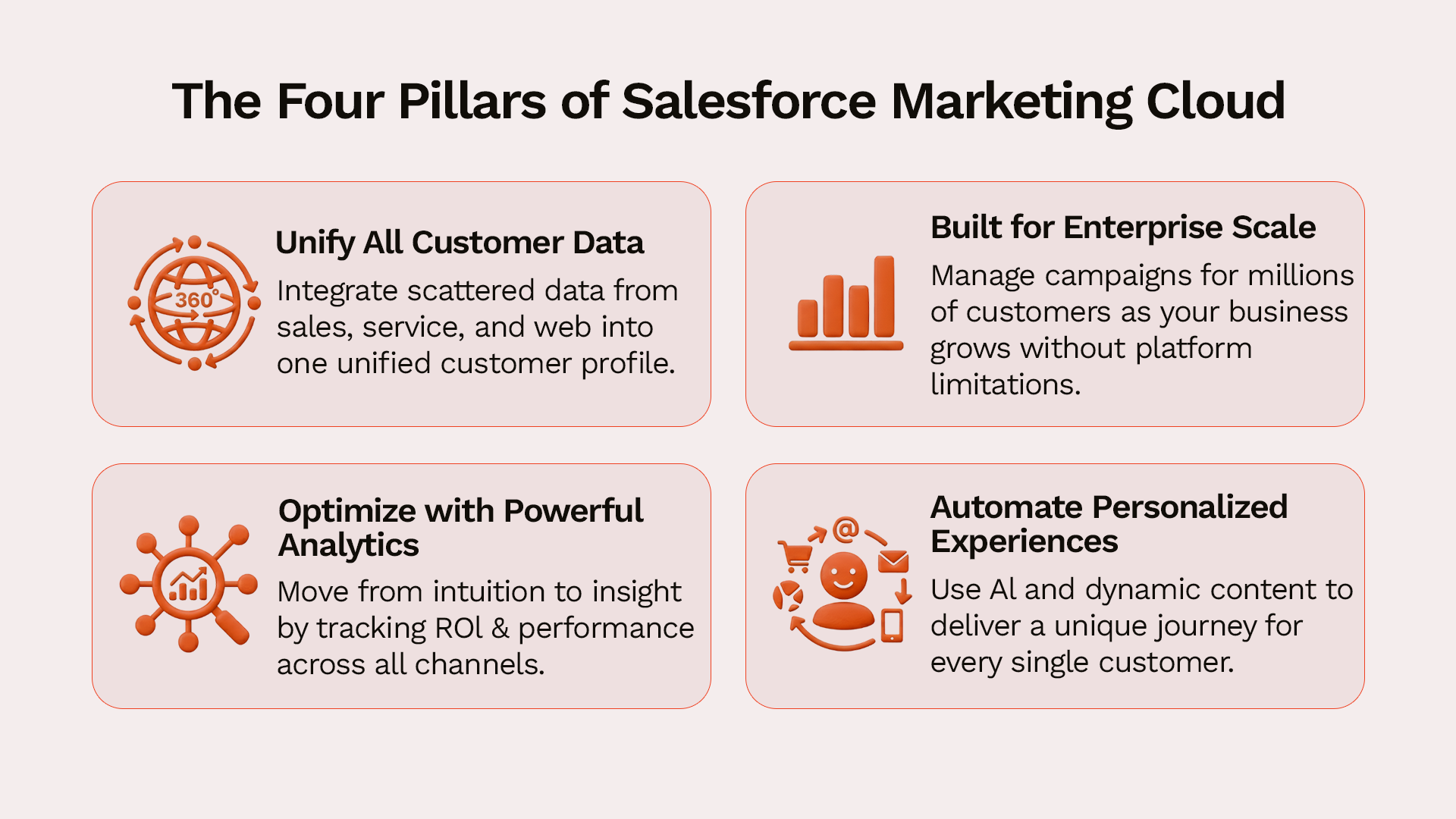 The Solution: SFMC uses dynamic content, AI-powered recommendations, and automated journey logic to deliver personalized experiences to every customer without requiring manual intervention. A retail brand can show different products to different customers in the same email campaign. A financial services company can deliver different educational content based on the customer life stage.